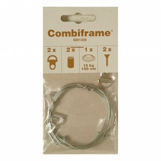 Set bestaande uit 1,5 meter staaldraad, 2 knijpbusjes (om het staaldraad vast te zetten), 2 oogjes en schroefjes.